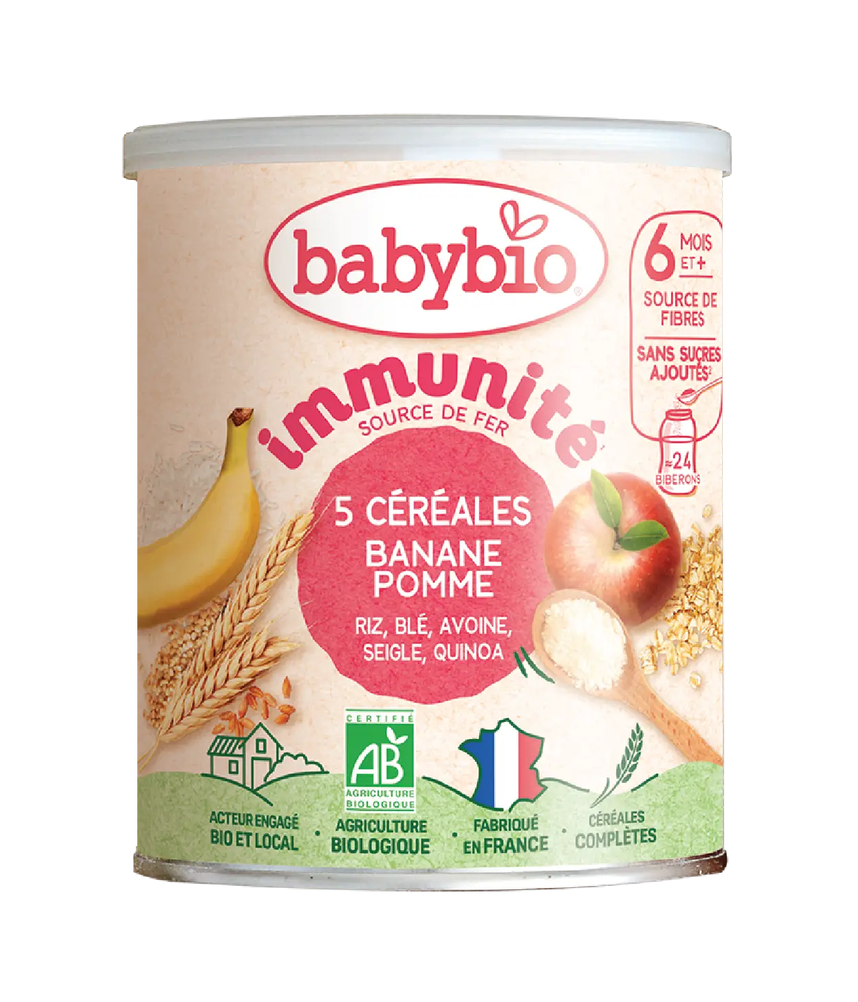 បបរគ្រាប់ធញ្ញជាតិសរីរាង្គ Babybio ផលិតឡើងដោយគ្រាប់ធញ្ញជាតិសរីរាង្គជាច្រើន មុខរួមផ្សំនិងបន្លែផ្លែឈើសរីរាង្គ ជាអាហារបន្ថែមសម្រាប់ទារកចាប់ពីអាយុ៦ខែឡើង។
